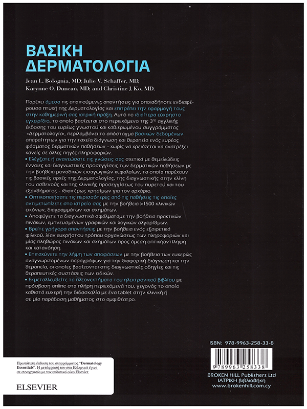 Παρέχει άμεσα τις απαιτούμενες απαντήσεις για οποιαδήποτε ενδιαφέρουσα πτυχή της Δερματολογίας και επιτρέπει την εφαρμογή τους στην καθημερινή σας ιατρική πράξη. Αυτό το ιδιαίτερα εύχρηστο εγχειρίδιο, το οποίο βασίζεται στο περιεχόμενο της 3ης αγγλικής έκδοσης του ευρέως γνωστού και καθιερωμένου συγγράμματος “Δερματολογία”, περιλαμβάνει το απόσταγμα βασικών δεδομένων απαραίτητων για την ταχεία διάγνωση και θεραπεία ενός ευρέος φάσματος δερματικών παθήσεων – χωρίς να χρειάζεται να ανατρέξει κανείς σε άλλες πηγές πληροφοριών.